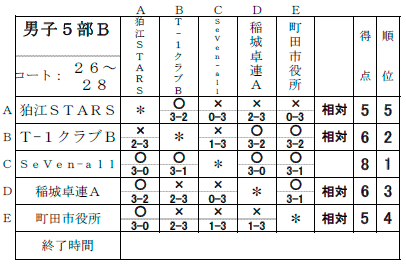 2023年度下期リーグ戦(男子1,2,3,4,5部の結果) 2023年11月19日2025年5月28日 令和5年11月18日(土) 日野市南平体育館 ★男子1部 ★男子2部 ★男子3部 ★男子4部 ★男子5部