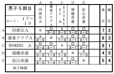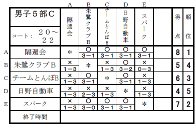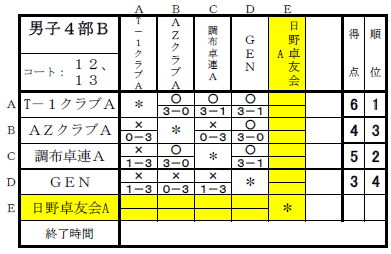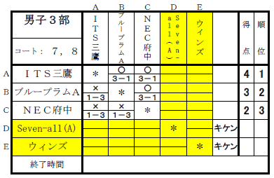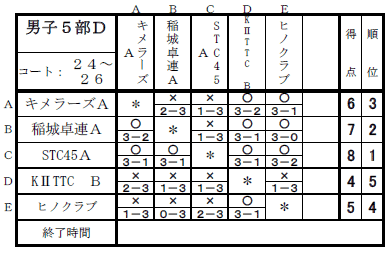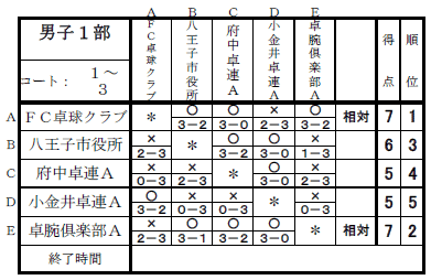 2025年度下期リーグ戦(男子1,2,3,4,5部の結果) 2026年3月7日2026年3月7日 日時:2026年2月14日(土)会場: 稲城市総合体育館 ★男子1部 ★男子2部 キケンチーム KⅡTTCA ★男子3部 キケンチーム Seven-all(A)・ウィンズ ★男子4部 キケンチーム 日野卓友会A ★男子5部